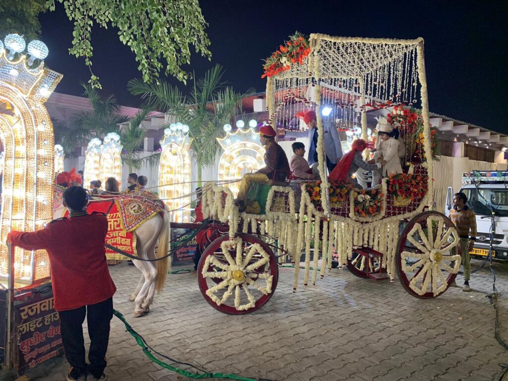Sudhir Band, also known for the wedding baggi in Agra, presents our clients with fashionable Baggi (Chariot) Services which is one of the most essential parts of Indian Weddings. Baggi provided by Sudhir Band is fully decorated with flowers.